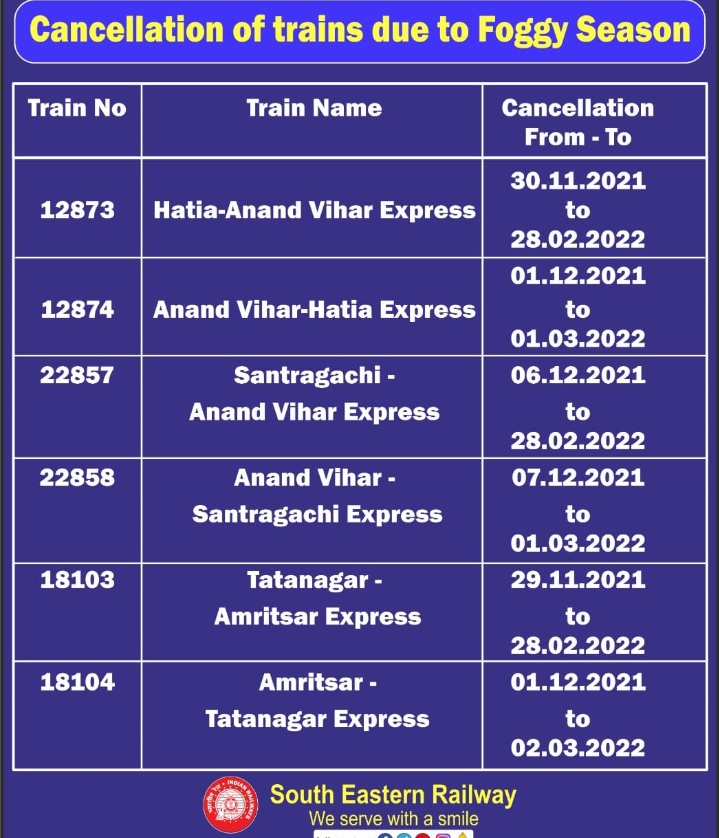 रेलवे ने  जाड़े के मौसम में होने वाले कुहासा को देखते हुए कई ट्रेनों को रद्द करने का फैसला लिया। इस दौरान झारखंड से खुलने या गुजरनेवाली ट्रेनें भी शामिल हैं। वही उसे लेकर दक्षिण पूर्व रेलवे नें अधिसुचना जारी कर दी है।अधिसुचना के मुताबिक 6 ट्रेनों को रद्द किया है। जबकि एक ट्रेन कें परिचालन की अवधी में कमी की हैं।दक्षिण पूर्व रेलवे के द्रारा जारी अधिसुचना के मुताबिक रद्द होने वाली ट्रेनों टाटा हो कर गुजरने वाली संतरागाछी – आनन्द विहार –संतरागाछी एक्सप्रेस और टाटा –अम़ृतसर एक्सप्रेस  दोनो दिशाओ में रद्द किया गया है। इसके अलावे हटिया से खुलने वाली हटिया-आनन्द विहार एक्सप्रेस भी दोनों दिशाओ मे रद्द रहेगी। वही पटना –रांची –पटना एक्सप्रेस हर शुक्रवार को रद्द रहेगा।