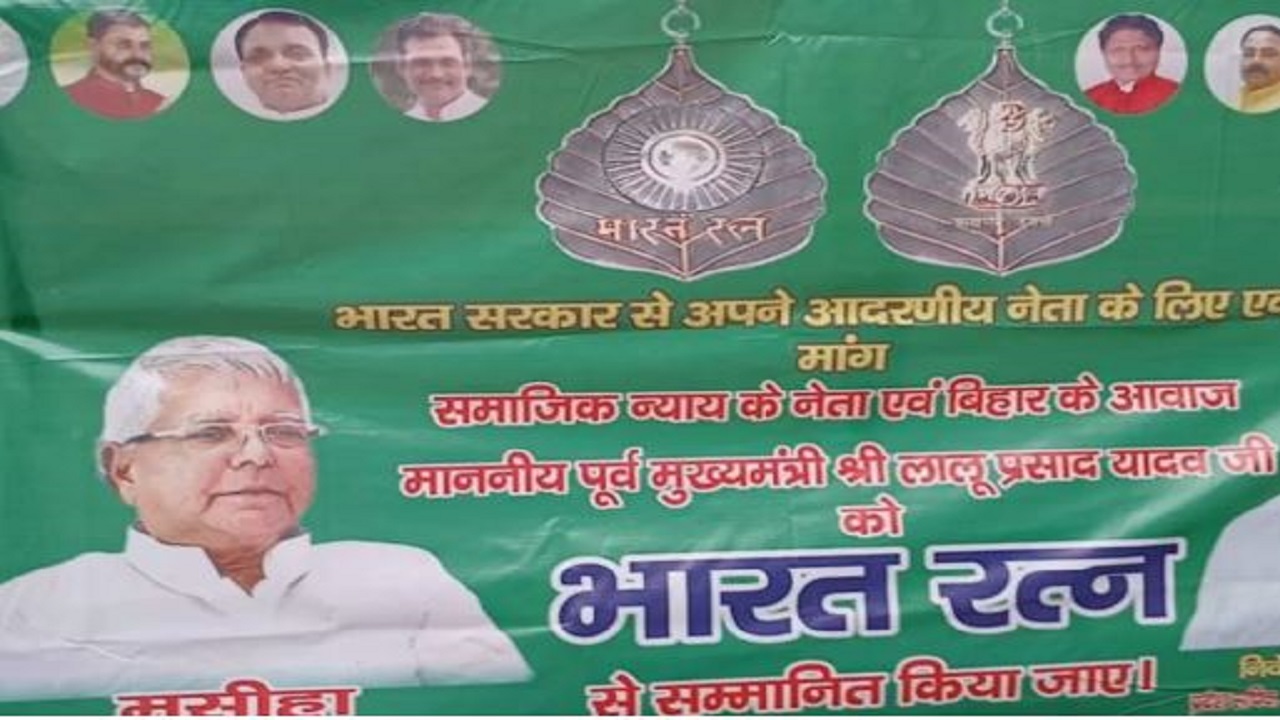 बिहार में भारत के सर्वोच्च नागरिक सम्मान ‘भारत रत्न’ को लेकर सियासी घमासान छिड़ गया है। हाल ही में जेडीयू के वरिष्ठ नेता केसी त्यागी ने मुख्यमंत्री नीतीश कुमार को भारत रत्न से नवाजे जाने की मांग की थी। जिसके बाद राष्ट्रीय जनता दल सुप्रीमो लालू यादव के लिए ‘भारत रत्न’ की मांग हो रही है। इस बीच पटना में आरजेडी कार्यालय के बाहर लालू प्रसाद यादव को भारत रत्न देने की मांग को लेकर पोस्टर लगाए गए हैं।