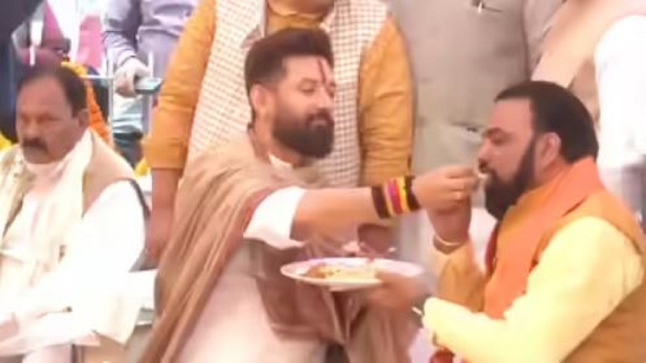 केंद्रीय मंत्री चिराग पासवान के पटना स्थित घर पर दही-चूड़ा भोज का वीडियो वायरल हो रहा है। वीडियो में साफ तौर से देखा जा सकता है कि बीजेपी नेता और डिप्टी सीएम सम्राट चौधरी को चिराग पासवान कैसे तिलकुट खिला रहे हैं। उसके बाद वो प्लेट में दही-चूड़ा भी खाते हुए दिख रहे हैं। इसके साथ ही बीजेपी के कार्यकारी अध्यक्ष भी चिराग पासवान के बगल में बैठकर दही-चूड़ा भोज का आनंद लेते हुए गुफ्तगू कर रहे हैं।