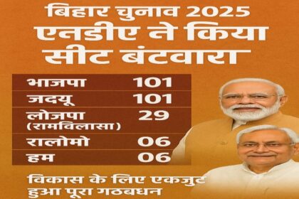 पटना: राष्ट्रीय जनतांत्रिक गठबंधन (एनडीए) ने बिहार विधानसभा चुनाव 2025 के लिए सीट बंटवारे की औपचारिक घोषणा कर दी है। भाजपा महासचिव विनोद तावड़े ने सोशल मीडिया प्लेटफॉर्म ‘एक्स’ पर इसकी जानकारी साझा करते हुए बताया कि सभी सहयोगी दलों ने आपसी सहमति और सौहार्दपूर्ण माहौल में सीटों का वितरण पूरा कर लिया है।