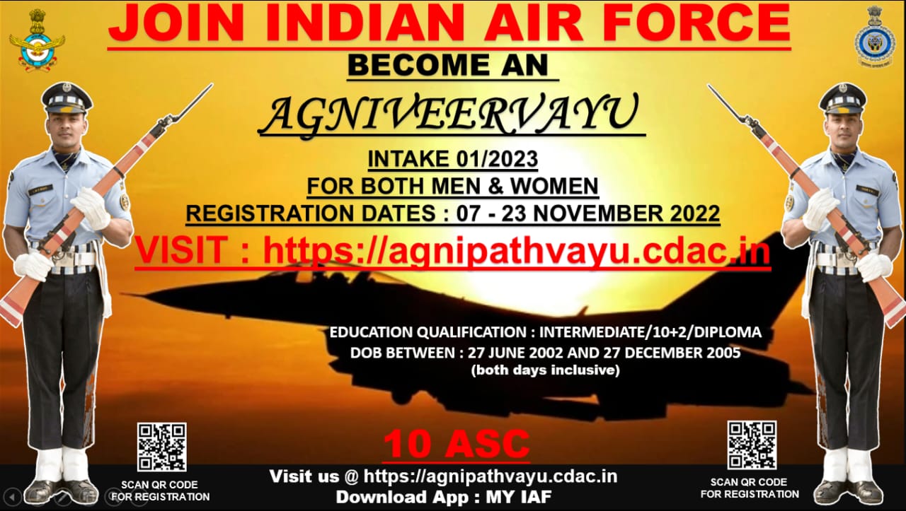 जमशेदपुर : भारतीय वायु सेना (IAF) में नौकरी करने की इच्छा रखने वाले युवाओं के लिए अच्छी ख़बर है। भारतीय वायुसेना में अग्निवीर वायु भर्ती 2023 के लिए नोटिफिकेशन जारी किया गया है। उम्मीदवार जो इस भर्ती के लिए आवेदन करना चाहते हैं वो अधिकारिक वेबसाइट agnipathvayu.cdac.in पर जाकर आवेदन कर सकते हैं। भर्ती के लिए रजिस्ट्रेशन की प्रक्रिया 7 नवंबर 2022 से शुरू है और आवेदन करने की आखिरी तारीख 23 नवंबर है। यह पहली बार है जब अग्निवीर वायु में युवक के साथ युवतियां के लिए भी आवेदन आवेदन आमंत्रित किये गए हैं।
