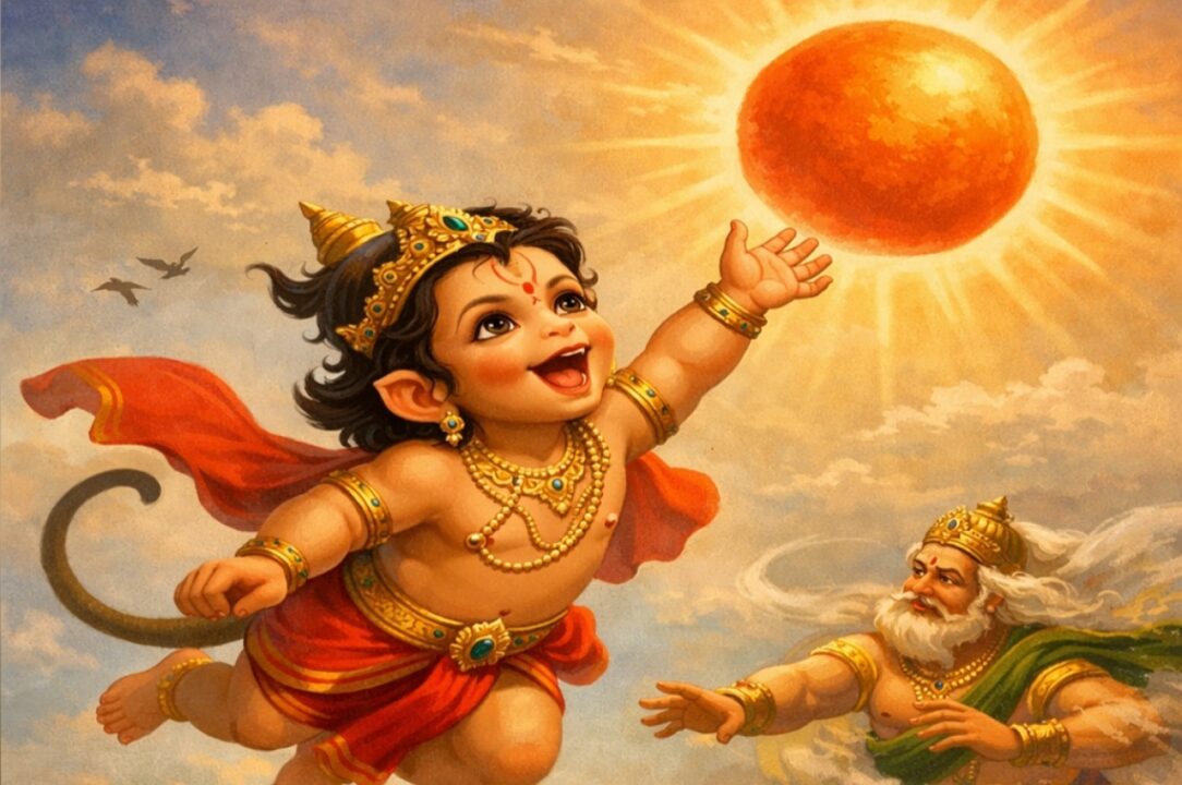 हनुमान जी के बाल्यकाल से जुड़ी एक प्रसिद्ध कथा के अनुसार, एक बार उन्हें भूख लगी तो उन्होंने आकाश में चमकते सूर्य को फल समझकर निगलने के लिए उड़ान भर ली। यह देखकर देवराज इंद्र ने वज्र से प्रहार किया, जिससे वे मूर्छित हो गए। इस घटना से क्रोधित होकर पवन देव ने समस्त ब्रह्मांड की वायु रोक दी।