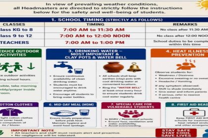 साथ में बच्चों को घर आते जाते वक्त टोपी, छाता इत्यादि से सिर ढककर रखने, विद्यालय के नजदीकी स्वास्थ्य केंद्र से संपर्क करके पर्याप्त मात्रा में ओ.आर.एस. तथा ग्लुकोज की उपलब्धता सुनिश्चित करने का निर्देश दिया है। उन्होंने कहा कि सभी शिक्षक एवं शिक्षा विभाग के सभी कर्मी की ये व्यक्तिगत जिम्मेदारी है कि कोई भी बच्चा तेज गर्मी अथवा लू की चपेट में न आए।