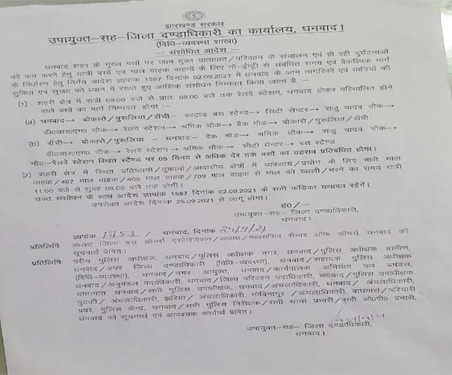 उपायुक्त ने पूर्व के आदेश को संशोधित करते हुए नया रूट जारी किया है। प्रशासन ने 2 सिंतबर, 2021 के आदेश में संशोधन किया है। जिसके तहत फिर से स्टेशन और बैंक मोड़ होकर बसों के परिचालन की अनुमति दे दी गई है,साथ ही शहरी इलाके में भारी वाहनों को प्रवेश की भी अनुमति भी दे दी गई है। कारोबारियों के मांग पर इसकी अनुमति दी गई है
