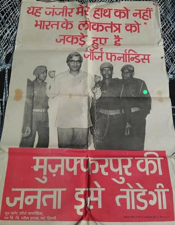 जमशेदपुर : देश के पूर्व प्रतिरक्षा मंत्री, जाने-माने अंतरराष्ट्रीय समाजवादी व अंतर्राष्ट्रीय मजदूर जॉर्ज फर्नांडिस का मुजफ्फरपुर की जनता से एक पोस्टर था। जिसमें उनके हाथों में बेड़ियां थी और उन्हें पुलिस के तीन जवान ने कैद कर रखा था। नीचे सिर्फ एक वाक्य था-‘यह जंजीर मेरे हाथ को नहीं भारत के लोकतंत्र को जकड़े हुए हैं।’ – जॉर्ज फर्नांडिस। उसके नीचे लिखा था। मुजफ्फरपुर की जनता इसे तोड़ेगी। इसी पोस्टर और जॉर्ज फर्नांडिस के जेल सलाखों के पीछे हथकड़ी लगी कट आउट को देखकर मुजफ्फरपुर की जनता ने 1977 में विश्व के जनतंत्र की सबसे बड़ी पंचायत लोकसभा में अपार बहुमत के साथ पहुंचा दिया। तब जॉर्ज बड़ोदरा डायनामाइट कांड में मुख्य अभियुक्त के रूप में जेल में कैद थे और उनके ऊपर मृत्युदंड तक का तलवार लटक रहा था। वह लोकनायक जयप्रकाश नारायण की एक अपील पर 3 लाख से भी ज्यादा वोटों से जीते। उनकी जीत का डंका पूरे देश और दुनिया में बजा और मुजफ्फरपुर एक बार फिर से सुर्खियों में आया। समाजवादी नेता डॉ. हरेंद्र कुमार बताते हैं कि हम लोग इस पोस्टर के लिए पागल थे। खुद साइकिल से घूम-घूम कर प्रचार करते थे। गोंद लगाकर पोस्टर को दीवाल से चिपकाते थे।