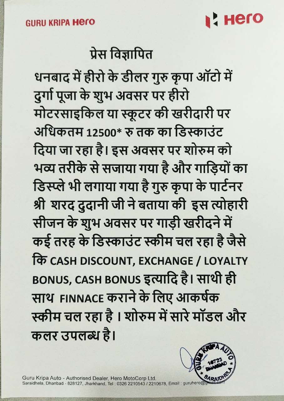 मिरर मीडिया धनबाद : दुर्गा पूजा के शुभ अवसर पर धनबाद स्थित दोपहिया वाहन हीरो के डीलर गुरु कृपा ऑटो में मोटरसाइकिल या स्कूटर की खरीदारी पर अधिकतम 12,500 रूपये तक की छूट दी जा रही हैं। इस अवसर पर शो रूम को भव्य तरीके से सजाया गया हैं। इसके साथ ही गाड़ियों का डिस्प्ले भी लगाया गया हैं।
