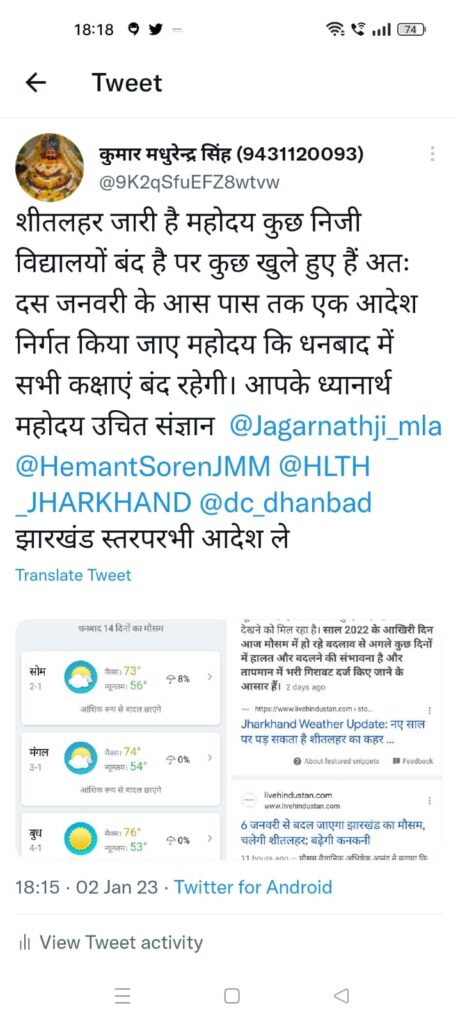 शीतलहर जारी है महोदय कुछ निजी विद्यालयों बंद है पर कुछ खुले हुए हैं अतः दस जनवरी के आस पास तक एक आदेश निर्गत किया जाए महोदय कि धनबाद में सभी कक्षाएं बंद रहेगी। वहीं इसके साथ ही अभिभावक महासंघ धनबाद का प्रतिनिधि मंडल भी इस बाबत उपायुक्त से मिलकर आग्रह करेगा।