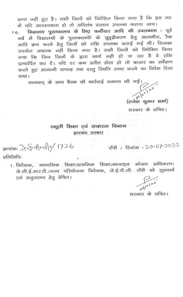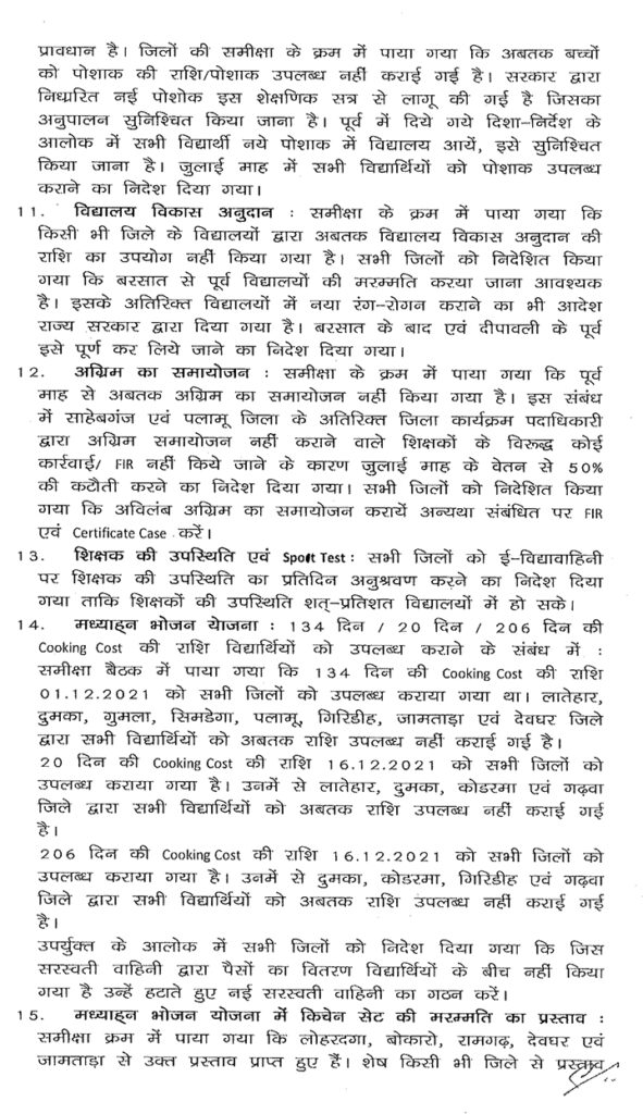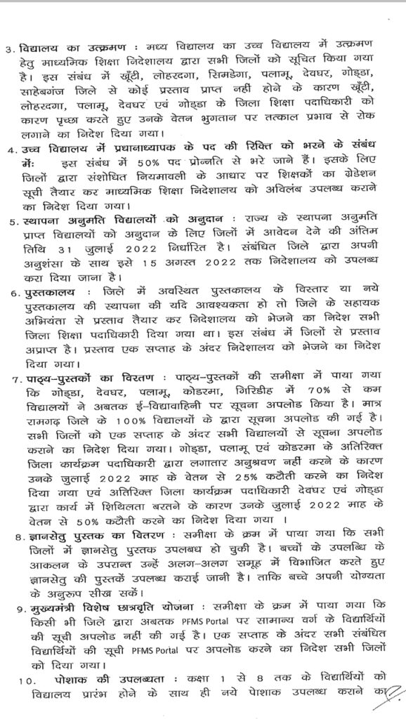 इसी क्रम में धनबाद जिले के आदर्श विद्यालयों में रिक्तियों के संबंध में प्रतिवेदन मांगा गया था। वहीं विद्यालयों में रिक्त शिक्षक के पद की मांगी गई सूची नहीं देने पर धनबाद के जिला शिक्षा पदाधिकारी प्रबला खेस का वेतन रोकने का निर्देश दिया गया है।