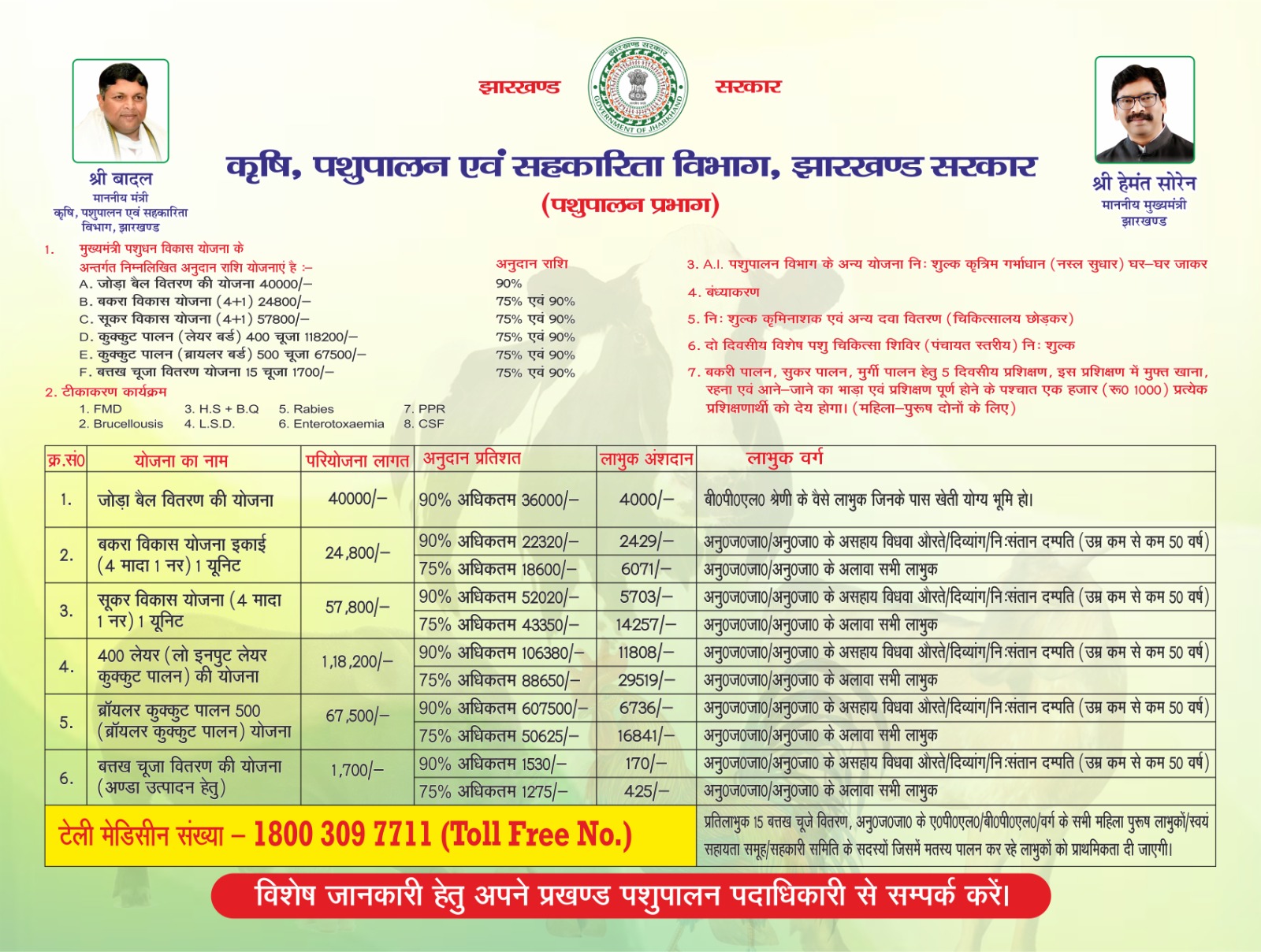 जमशेदपुर : झारखंड सरकार द्वारा शुरू की गई मुख्यमंत्री पशुधन विकास योजना एक महत्वपूर्ण पहल है, जो राज्य में पशुपालन को बढ़ावा देने और ग्रामीण अर्थव्यवस्था को मजबूत करने में महत्वपूर्ण भूमिका निभा रही है। इस योजना के तहत पशुपालकों को पशुओं की खरीद के लिए अनुदान राशि तथा पशु शेड निर्माण, टीकाकरण, कृत्रिम गर्भाधान, बंध्याकरण, कृमिनाशक दवा वितरण, विशेष पशु चिकित्सा शिविर, पशु पालन के लिए प्रशिक्षण आदि निःशुल्क दिया जाता है। इस योजना के द्वारा पशुपालकों को आर्थिक रूप से सशक्त होने में सहायता मिलती है। जिससे वे पशुपालन को अपना मुख्य व्यवसाय बना कर उसे और विस्तृत कर सकते हैं। इससे पशुपालन को बढ़ावा मिलता है, जिससे दूध, मांस, अंडे आदि के उत्पादन में वृद्धि होती है। इससे ग्रामीण क्षेत्रों में रोजगार के अवसरों में वृद्धि होती है और ग्रामीणों का जीवन स्तर सुधरता है।