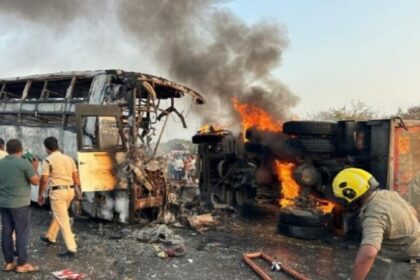 आंध्र प्रदेश के मरकापुरम जिले में एक भीषण सड़क हादसा हुआ है। रायवरम के पास एक निजी ट्रैवल्स बस और एक टिपर लॉरी के बीच हुई टक्कर के बाद बस में आग लग गई। जिसमें 14 यात्रियों की जलकर मौत हो गई। कई अन्य यात्री गंभीर रूप से घायल हो गए।