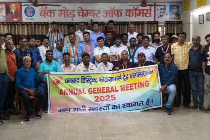 धनबाद। आज दिनांक 02 नवंबर 2025 को धनबाद डिस्ट्रिक्ट फोटोग्राफर्स ट्रेड एसोसिएशन की वार्षिक आम बैठक का आयोजन चैंबर ऑफ कॉमर्स, बैंक मोड़, धनबाद में किया गया। बैठक की अध्यक्षता सुनील कुमार सिंह ने की।