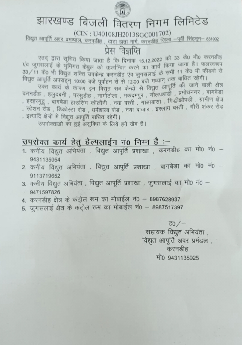 जमशेदपुर : जमशेदपुर विद्युत डिवीजन के तहत विद्युत आपूर्ति अवर प्रमंडल छोटा गोविंदपुर इलाके के बस्तियों में कल बिजली आपूर्ति बाधित रहेगी। मिली जानकारी के मुताबिक छोटा गोविंदपुर के अंतर्गत 11 केवी बारीडीह फीडर तथा विद्युत शक्ति उपकेंद्र सिदगोड़ा के 11केवी बागुनहातु फीडर सुबह 10 बजे से दोपहर 2 बजे तक बंद रहेंगें। लाइन मरम्मती तथा रखरखाव (जम्पर , पेड़ की डाली छटाई, ट्रांसफार्मर, ए बी स्वीच, कनेक्टर इत्यादि का सप्ताहिक मरम्मती) करने के कारण इन सभी फीडरों से विद्युत आपूर्ति कल बंद रहेगी।