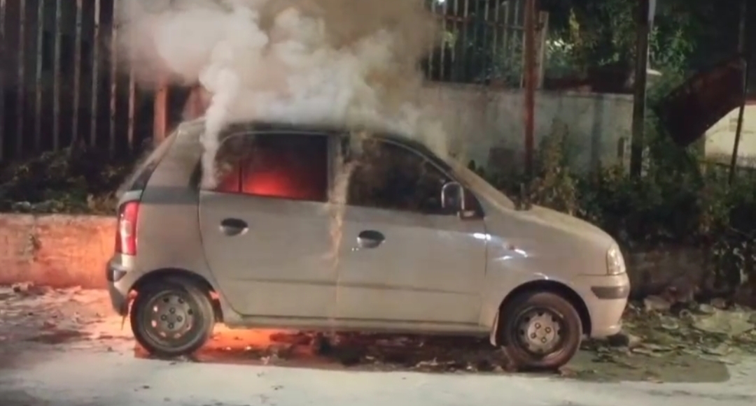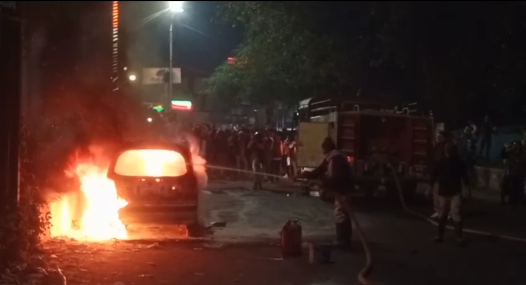 Dhanbad: स्टेशन रोड पर खड़ी लावारिस सेंट्रो कार में लगी आग, मची अफरा-तफरी